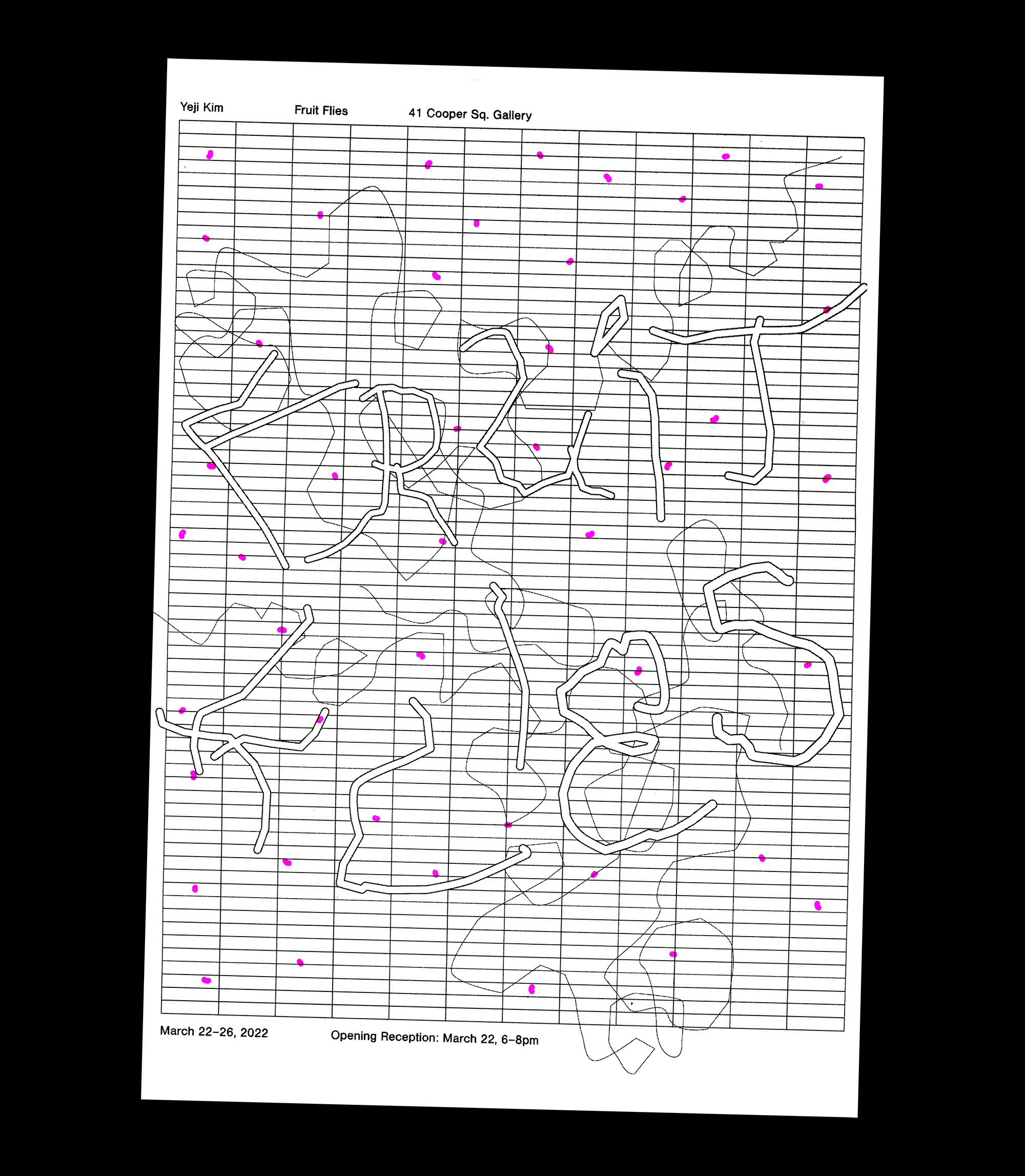 Exhibition identity and poster for my solo thesis show, Fruit Flies, which showcased various paintings, posters, books, prints, ceramic sculptures, and animations based on typologies created through narratives of displacement.
